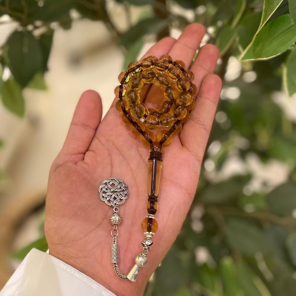 سبحة كسوف الشمس من البكلايت الشفاف تتميز بخرزات شفافة تعكس الضوء بشكل رائع، مع خيط بني يعكس ألوان كسوف الشمس الدافئة. تضفي ا لمسة نهائية متناسقة وجذابة، مما يجعلها تعبيرًا أنيقًا عن توازن الألوان.